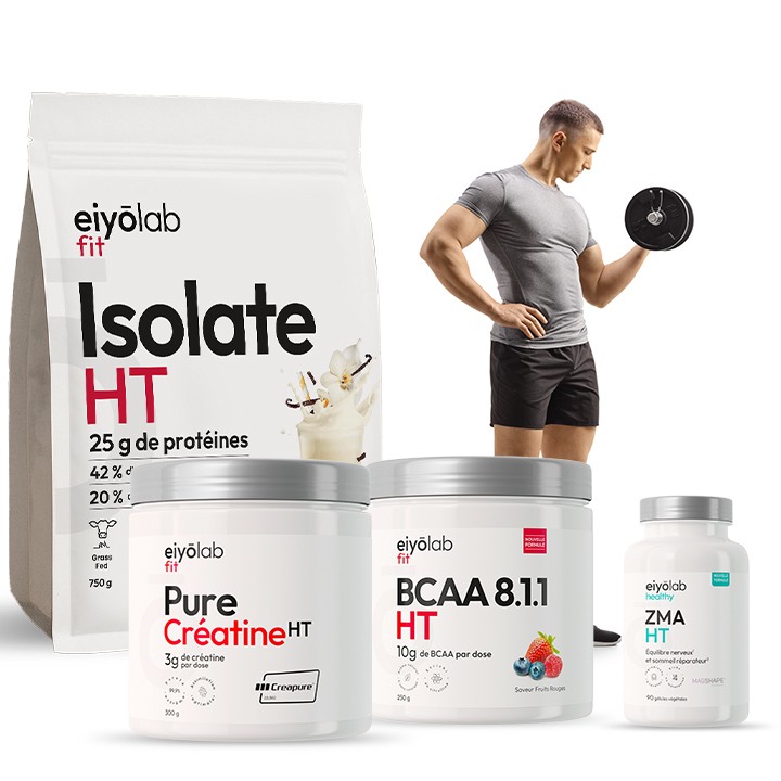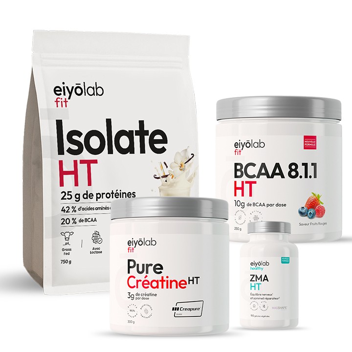 La composition du pack : Isolate HT – 750g, Pure Créatine HT – 300g, BCAA 8.1.1 HT poudre – 250g, ZMA HT – 90 gélules.